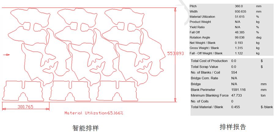 2.智能优化排样,最多支持4中坯料混合排样,核算材料利用率,材料成本,输出排样报告;